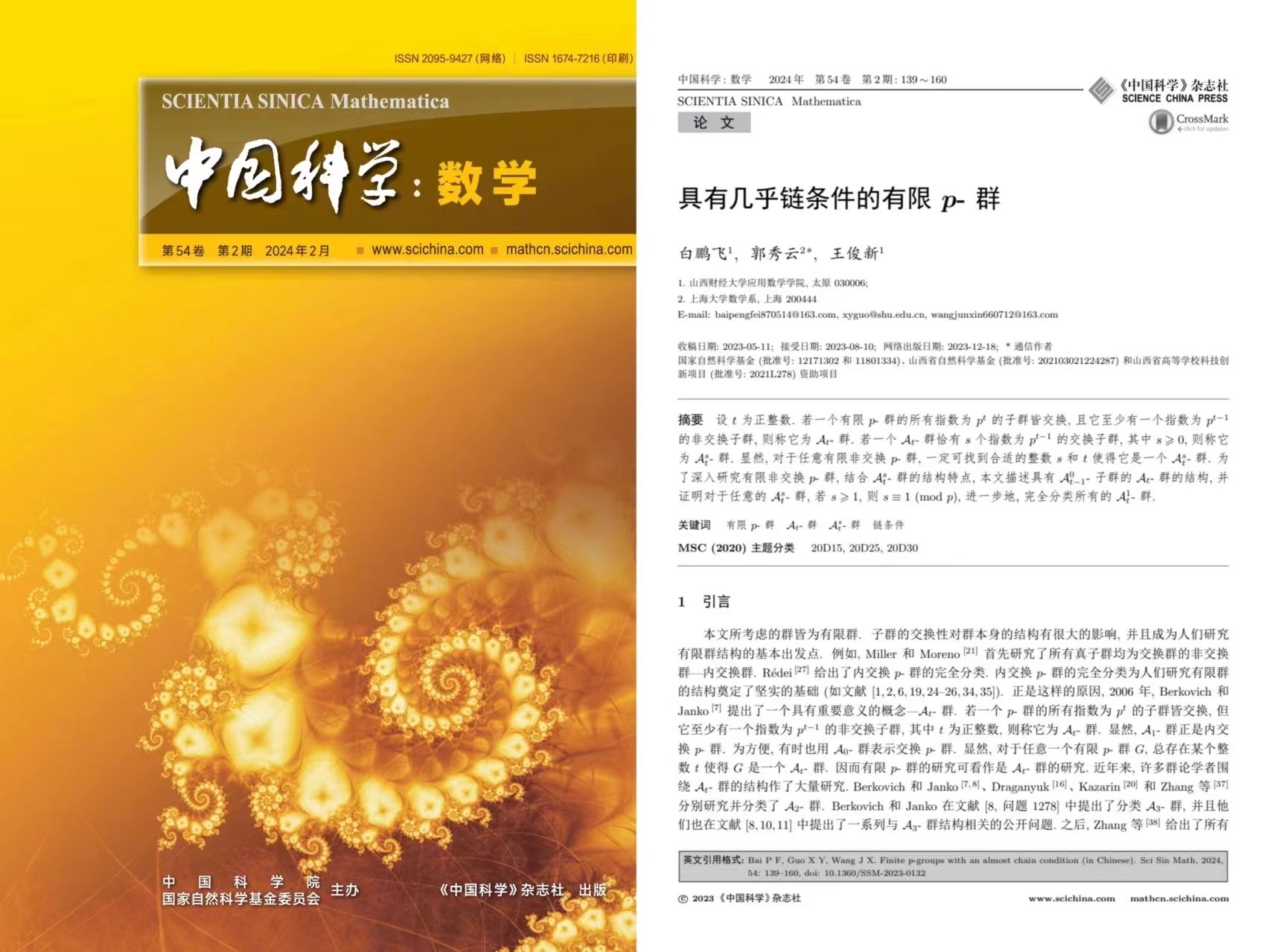 近日,beat365正版教师白鹏飞、王俊新的论文“具有几乎链条件的有限p-群”在《中国科学》2024年第2期发表(中国科学: 数学, 2024, 54(2): 139–160. DOI: 10.1360/SSM-2023-0132)。