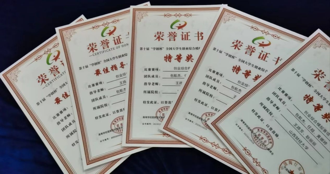 从山西省选拔赛到国赛初赛再到最后的国赛总决赛,“晋击的山财人”一路过五关斩六将。在山西省选拔赛中,“晋击的山财人”团队以超出第二名14分小组第一成绩荣获山西省特等奖。在国赛半决赛中,以小组第一并领先第二名四分的成绩出线拿下全国总决赛的门票。最后在总决赛中稳扎稳打,时刻分析对手决策、观察市场动向,合理制定策略,最后成功在总决赛中脱颖而出并荣获“学创杯”特等奖的最高奖项。