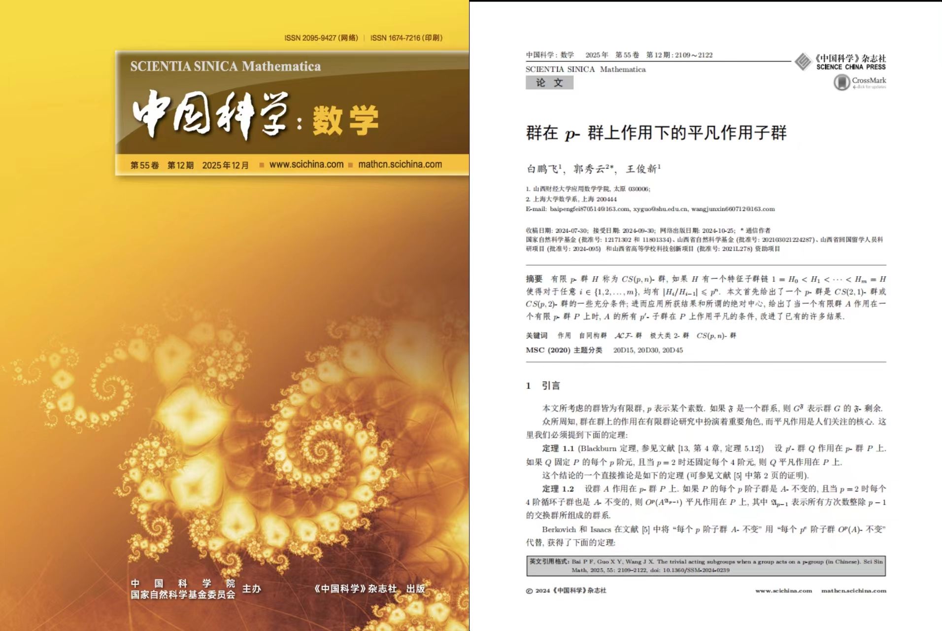 在基础数学研究方面,白鹏飞与王俊新老师的合作论文《群在p-群上作用下的平凡作用子群》发表于《中国科学:数学》2025年第12期。该研究从有限p-群的特征子群链入手,系统分析了CS(p,n)-群的结构与性质,并创新性地引入“绝对中心”概念,深入探讨了有限群作用在p-群上时,其p’-子群作用平凡的条件。这一成果不仅深化了有限群理论,也显著改进了该领域的若干经典结论,为后续相关研究提供了坚实的理论基础。