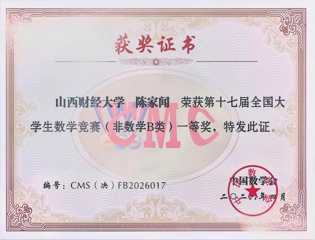 2026年4月18日,第十七届全国老员工数学竞赛决赛在四川大学与成都理工大学隆重举行。beat365正版2024级金融工程专业员工陈家闻,凭借扎实的数学功底与沉稳的临场发挥,斩获非数学B类全国一等奖。该类组别全国仅20人获此殊荣,奖项含金量极高。